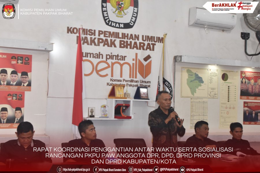 Njuahnjuah!!! #TemanPemilih, KPU Kabupaten Pakpak Bharat melaksanakan Rapat Koordinasi Penggantian Antar waktu serta Sosialisasi Rancangan PKPU PAW Anggota DPR, DPD, DPRD Provinsi dan DPRD Kabupaten/Kota pada Rabu, 17 September 2025 bertempat di Aula RPP KPU Kabupaten Pakpak Bharat. Basra Munthe Ketua KPU Kabupaten Pakpak Bharat membuka kegiatan secara resmi dan selanjutnya Pemaparan oleh oleh Welly Imron Cibro selaku Divisi Teknis Penyelenggara Pemilu menyampaikan pemaparan mengenai Penggantian Antar Waktu serta Sosialisasi Rancangan PKPU PAW Anggota DPR, DPD, DPRD Provinsi dan DPRD Kabupaten/Kota dilanjutkan diskusi mendengar masukan dan tanggapan dari peserta rapat kordinasi. Kegiatan dihadiri oleh Seluruh Anggota KPU Kabupaten Pakpak Bharat, Bawaslu Kabupaten Pakpak Bharat, Partai Politik Tingkat Kabupaten Pakpak Bharat, DPRD Kabupaten Pakpak Bharat, Pemerintah Kabupaten Pakpak Bharat serta jajaran Sekretariat KPU Kabupaten Pakpak Bharat. #KPUMelayani #KPUPakpakBharat ....