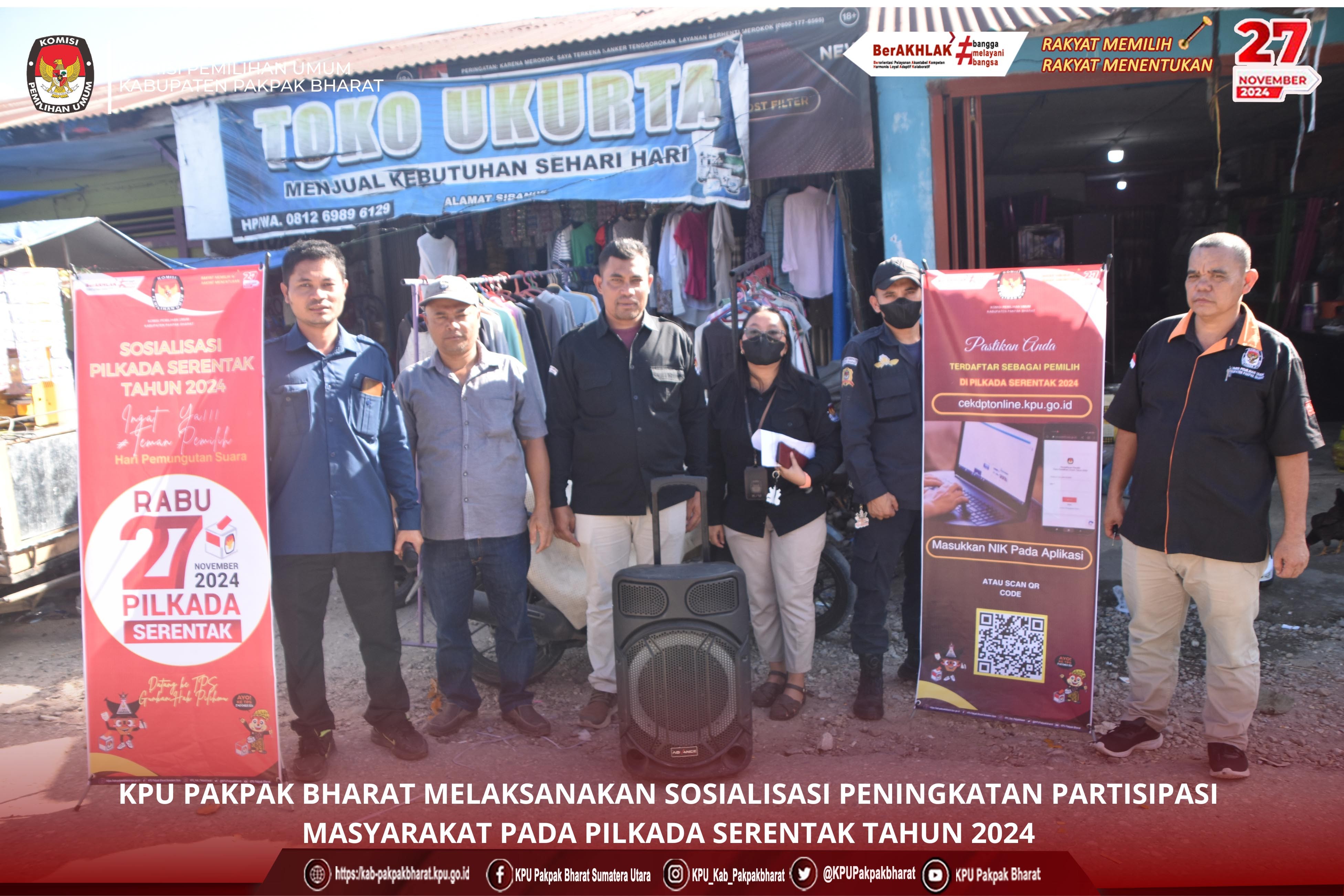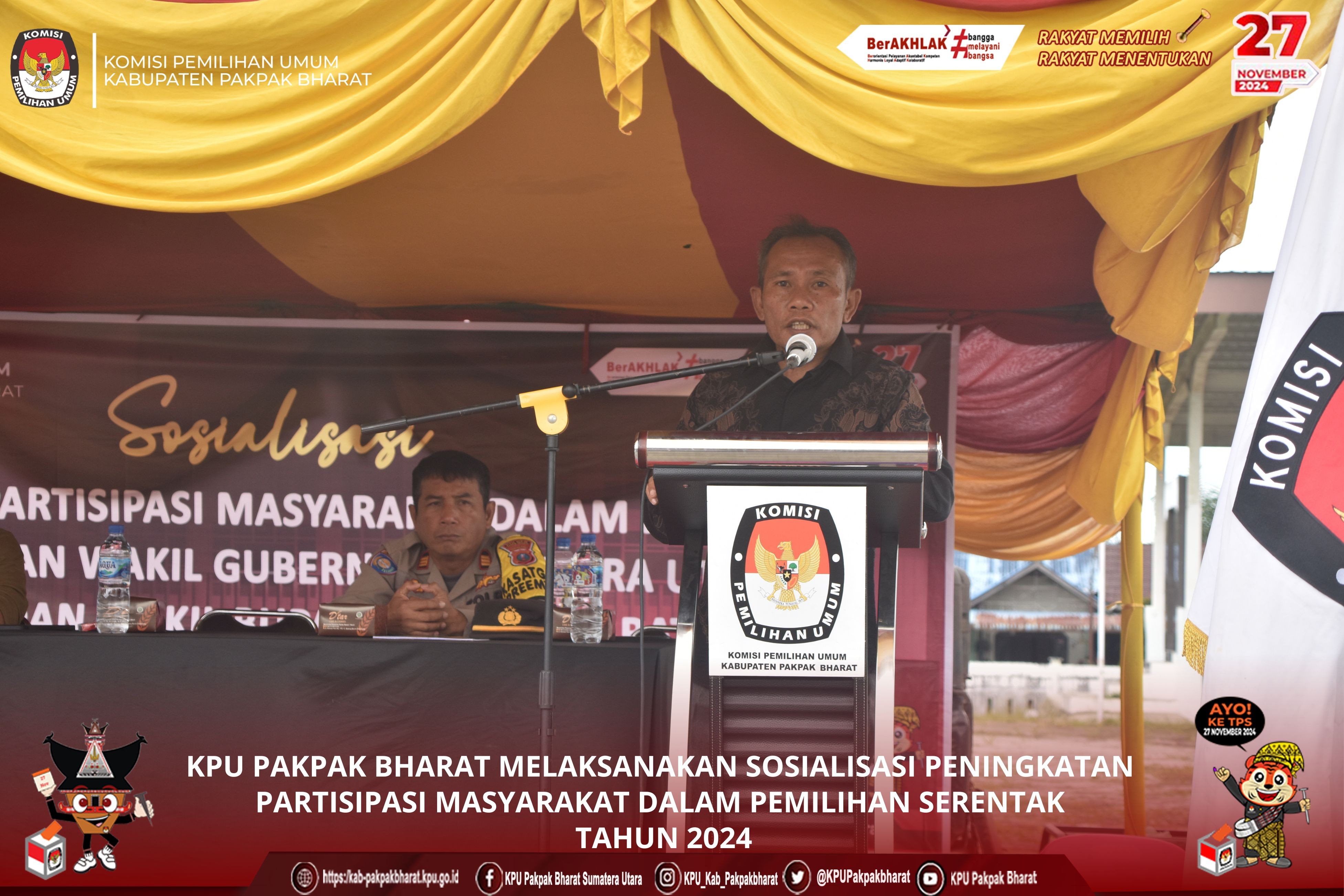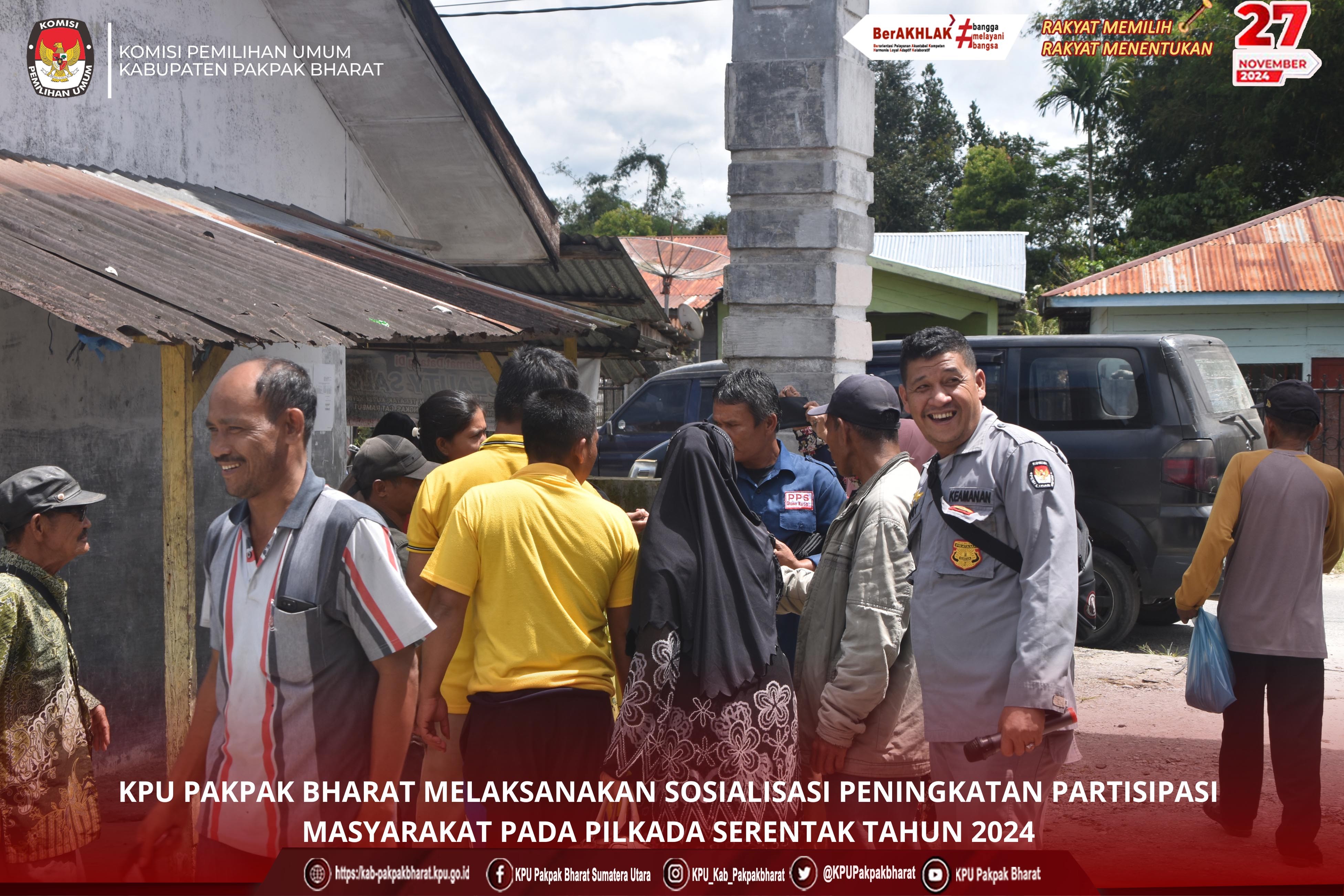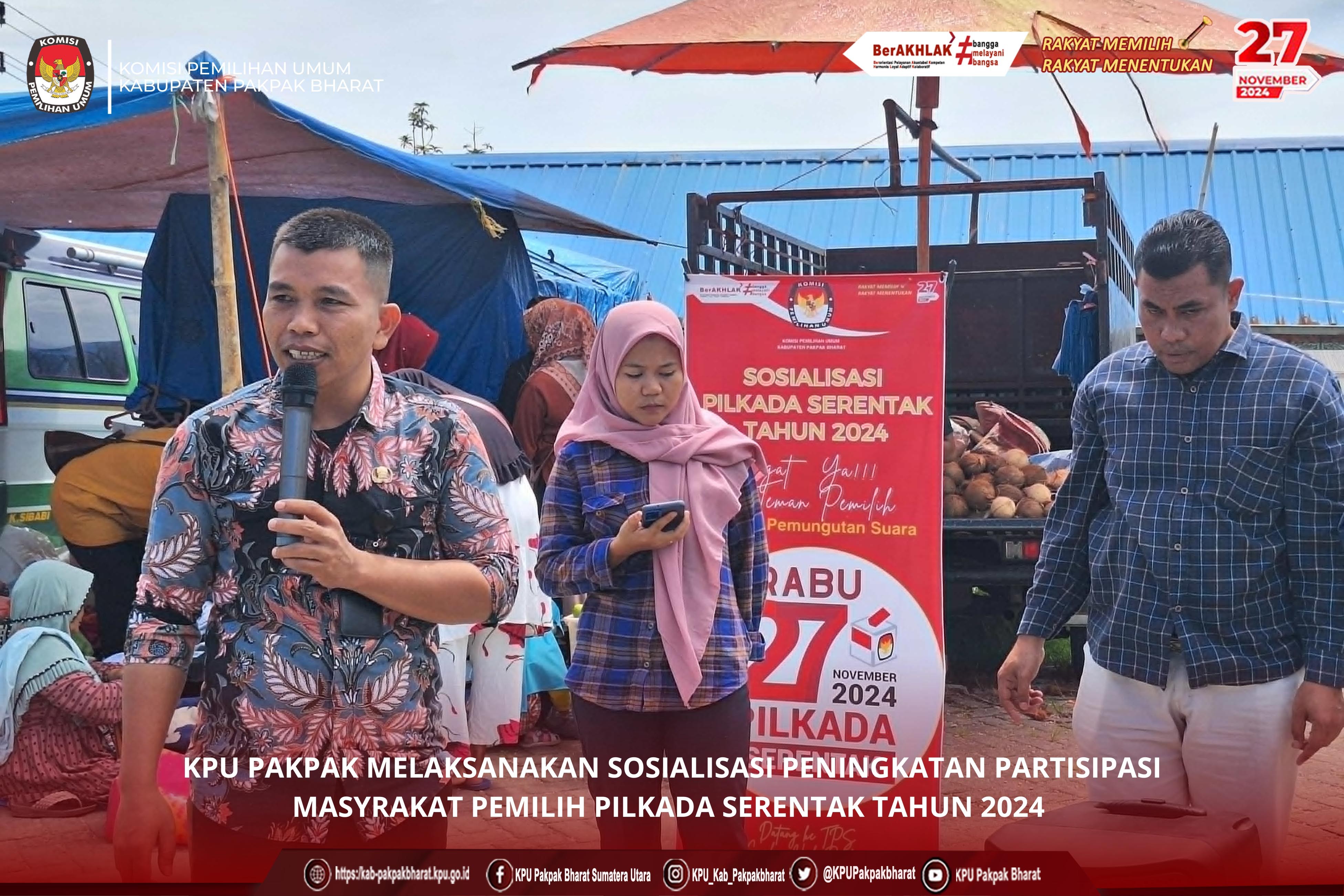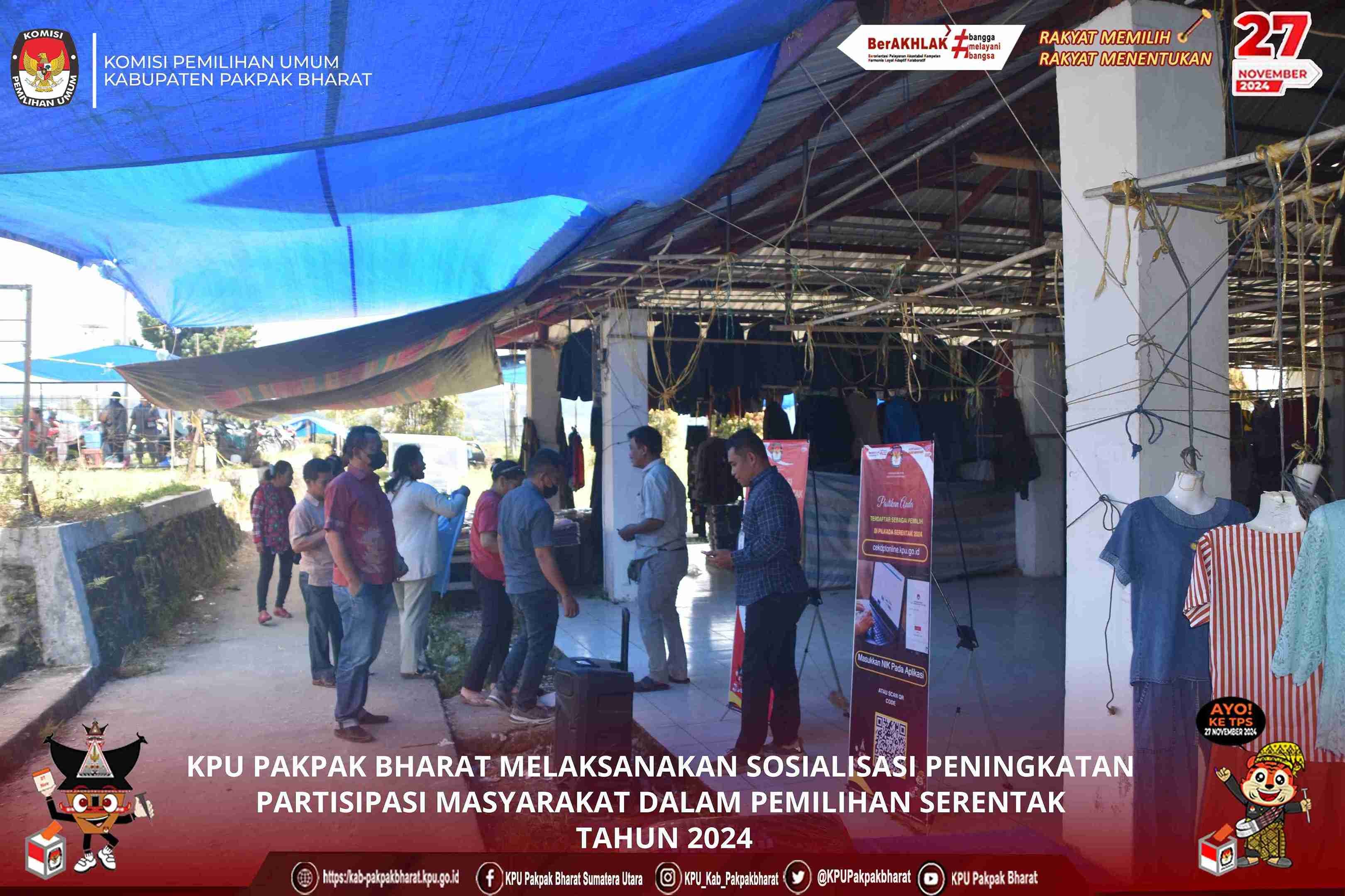 Njuahnjuah!!! #TemanPemilih, KPU Kabupaten Pakpak Bharat melaksanakan Sosialisasi Peningkatan Partisipasi Masyarakat dalam Pilkada Serentak Tahun 2024 bertempat di Onan Singgabur (Pasar Singgabur) Kecamatan Sitellu Tali Urang Julu pada Rabu, 23 Oktober 2024 Dalam Kegiatan dimaksud disosialisasikan mengenai Hari Pemungutan Suara yaitu pada Rabu, 27 November 2024, Cek Daftar Pemilih Tetap pada cekdptonline.kpu.go.id atau cek di kantor PPS, PPK maupun di kantor KPU Kabupaten Pakpak Bharat, syarat memilih dan informasi lainnya pada pemilihan Gubernur dan Wakil Gubernur Sumatera Utara dan Bupati dan Wakil Bupati Pakpak Bharat Tahun 2024. #KPUMelayani #PilkadaSerentak2024 #KPUPakpakBharat