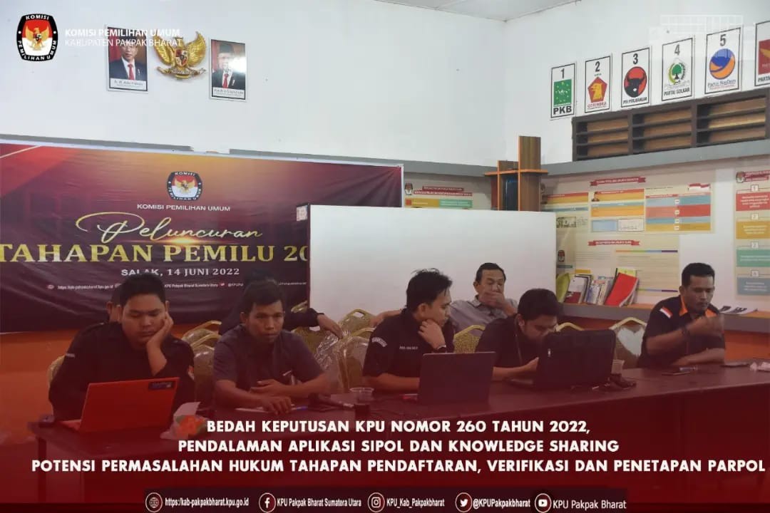 Salak (10/8) Komisi Pemilihan Umum Kabupaten Pakpak Bharat melaksanakan Bedah Keputusan KPU Nomor 260 Tahun 2022, pendalaman Aplikasi Sipol dan Knowledge Sharing potensi permasalahan hukum tahapan Pendaftaran, Verifikasi dan Penetapan Parpol calon Peserta Pemilu.