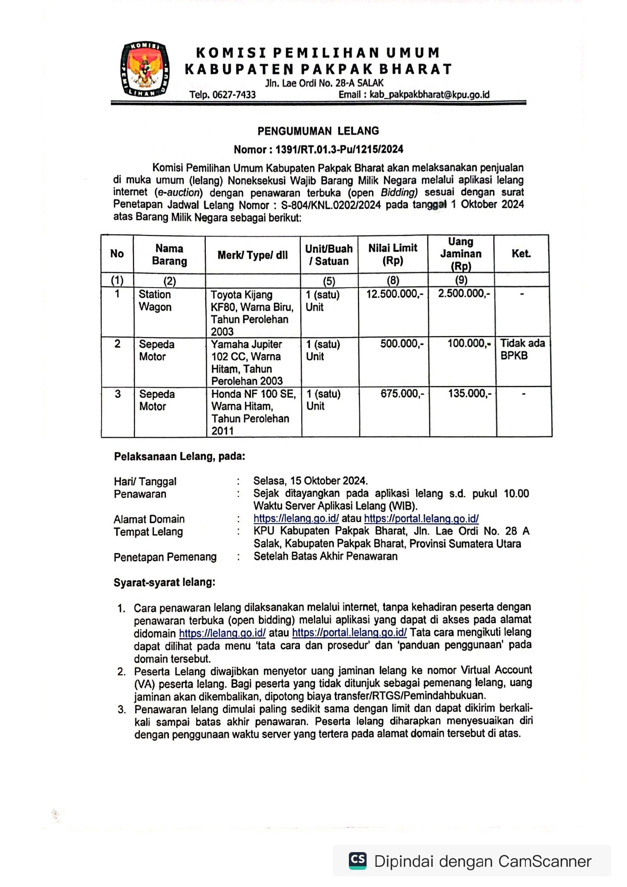 Berikut disampaikan Pengumuman Lelang Nomor 1391/RT.01.3-Pu/1215/2024