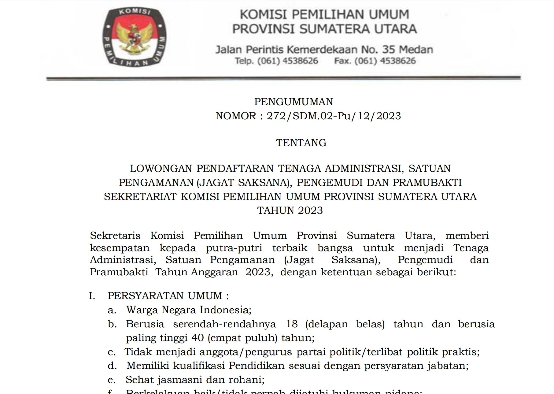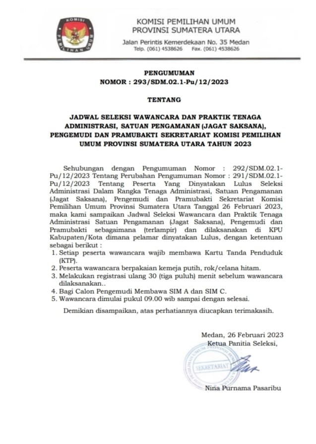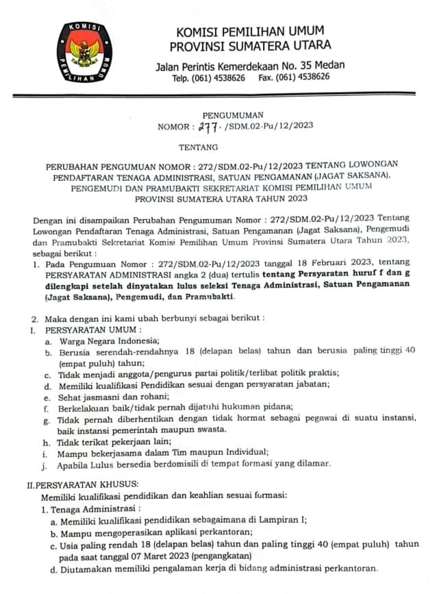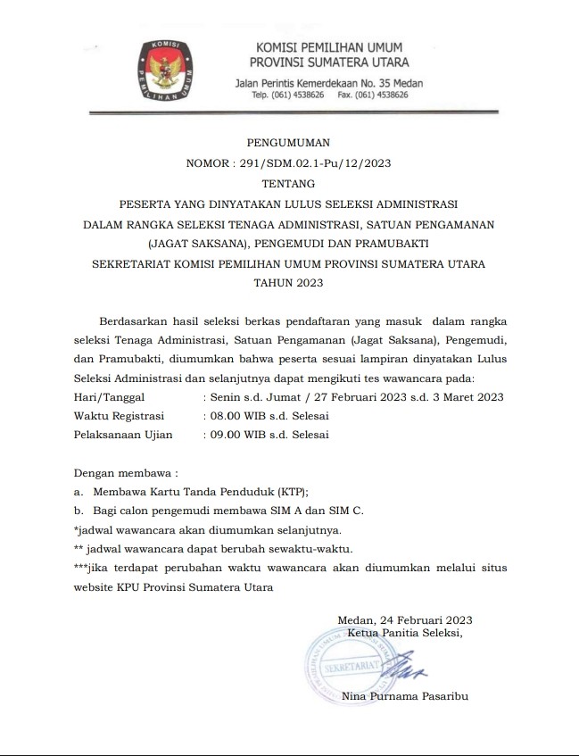 Berikut kami sampaikan nama-nama Peserta yang dinyatakan LULUS Seleksi Administrasi dalam rangka Seleksi Tenaga Administrasi, Satuan Pengamanan (Jagat Saksana), Pengemudi dan Pramubakti Sekretariat Provinsi Sumatera Utara Tahun 2023