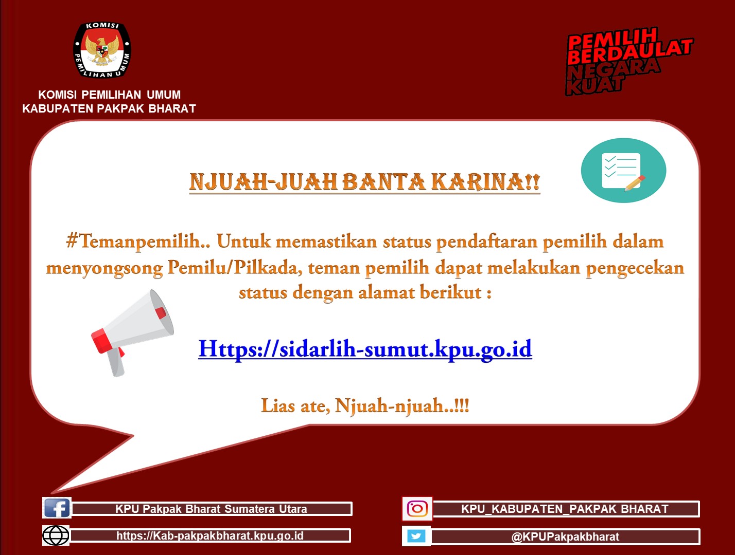 Untuk memastikan status pendaftaran pemilih dalam menyongsong Pemilu/Pilkada, KPU memfasilitasi status pendaftaran pemilih melalui Aplikasi SIDARLIH. Teman pemilih dapat melakukan pengecekan di alamat berikut : Https://sidarlih-sumut.kpu.go.id
