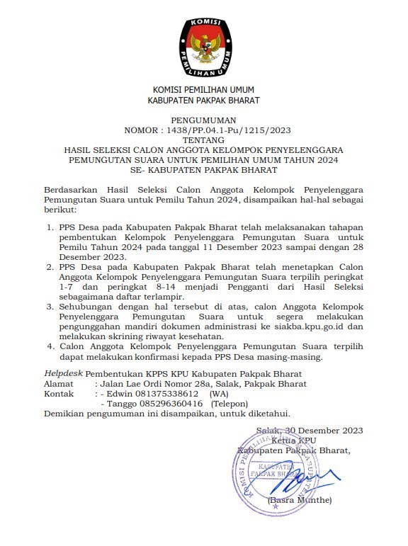 Senin, 25 Desember 2023 KPU Kabupaten Pakpak Bharat menyampaikan Pengumuman Hasil Penelitian Administrasi Calon Anggota KPPS untuk Pemilu Tahun 2024 Se-Kabupaten Pakpak Bharat. Pengumuman berisi nama-nama yang dinyatakan LULUS.