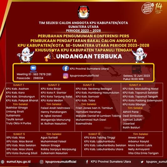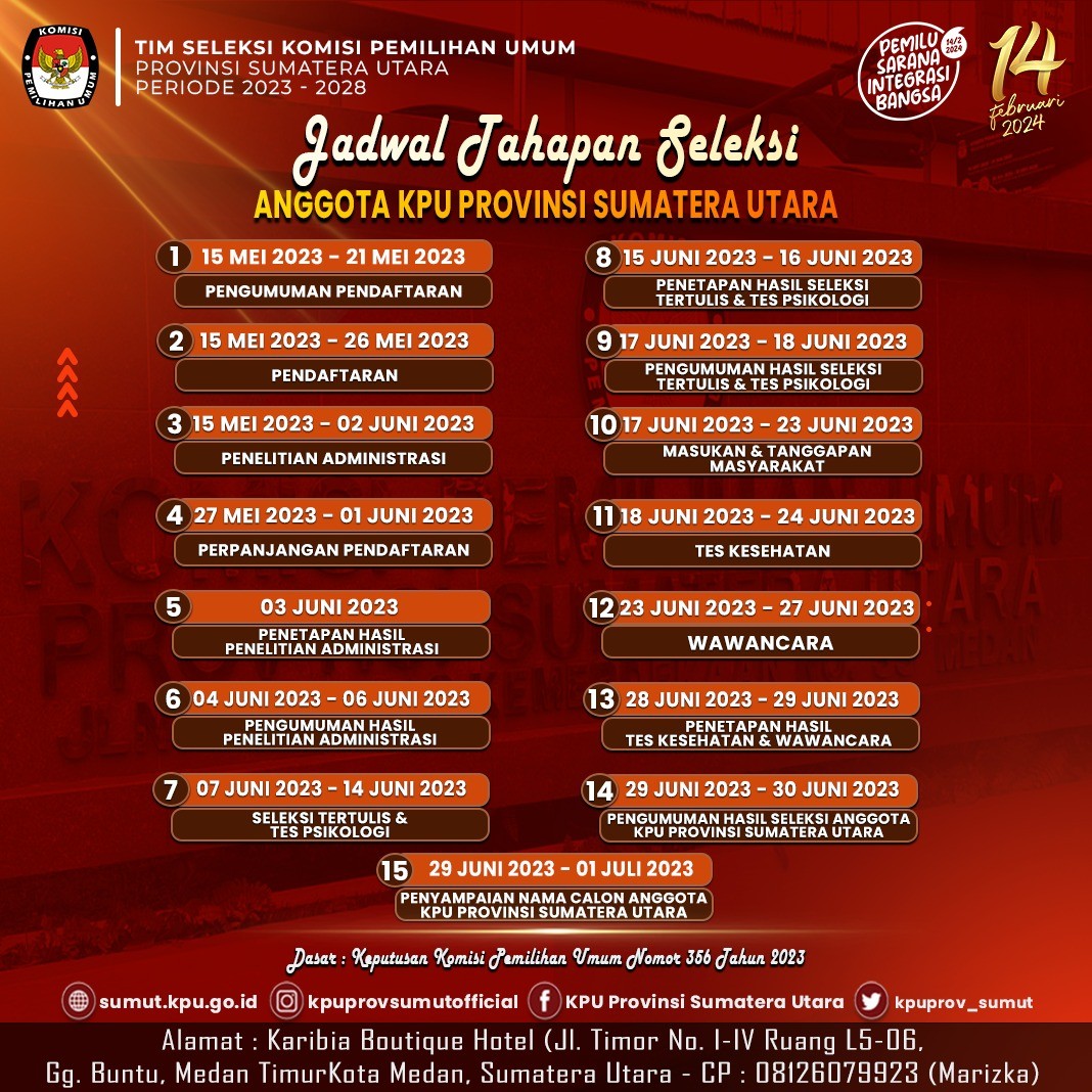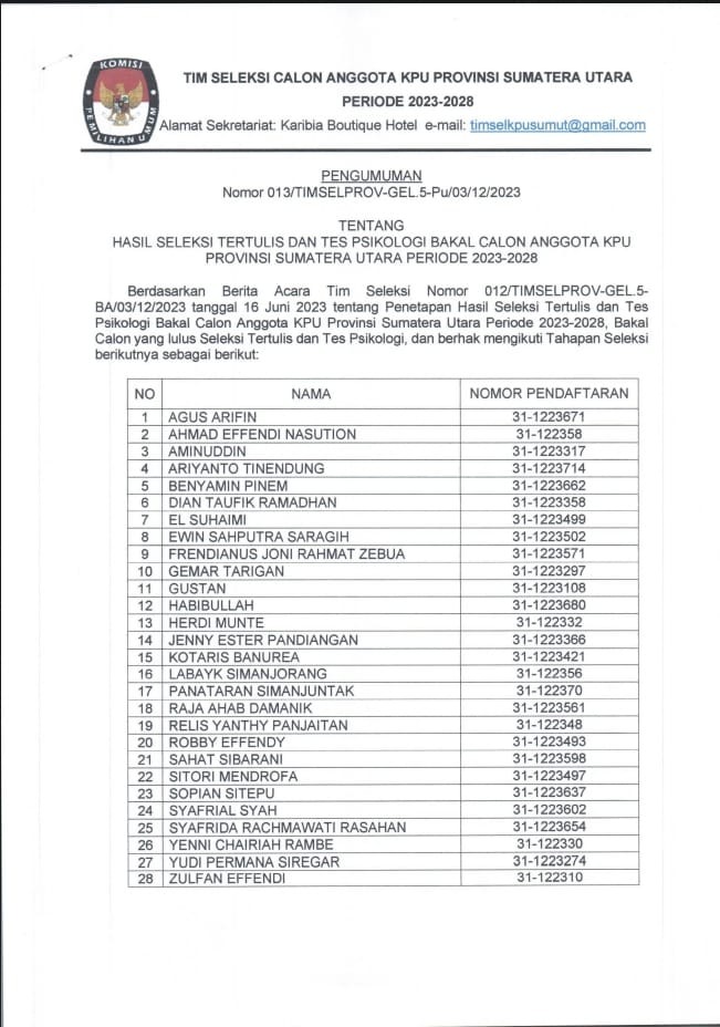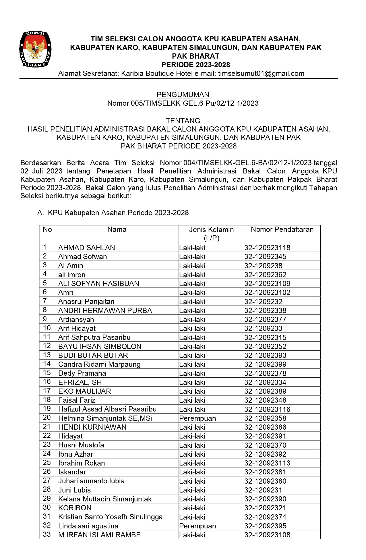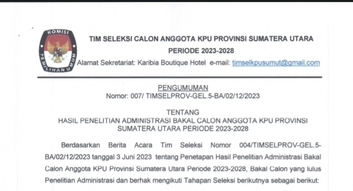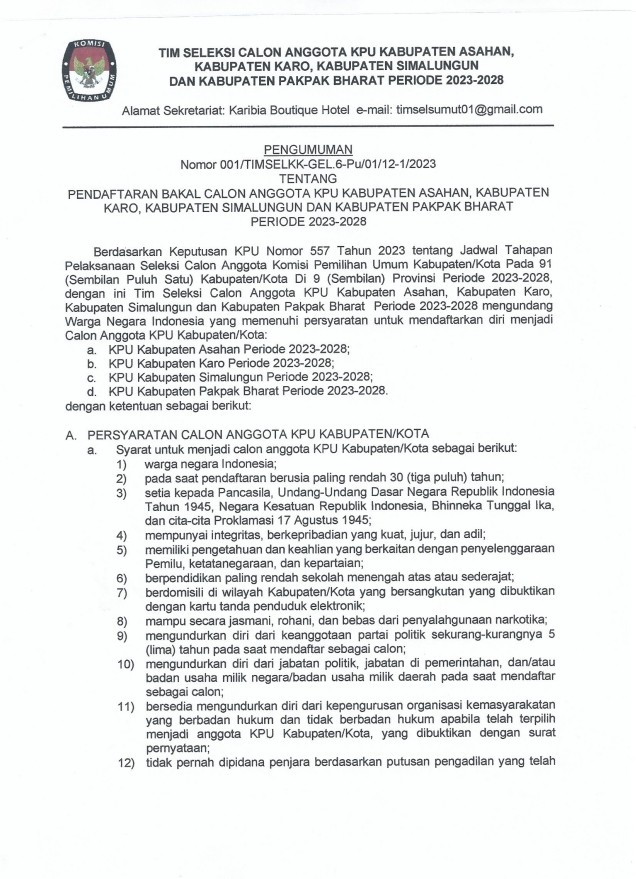 Selasa (13/6) Tim Seleksi Calon Anggota KPU Kabupaten Asahan, Kabupaten Karo, Kabupaten Simalungun dan Kabupaten Pakpak Bharat telah mengumumkan Pendaftaran Bakal Calon Anggota KPU melalu Pengumuman Nomor 001/TIMSELKK-GEL.6-Pu/01/12-1/2023.